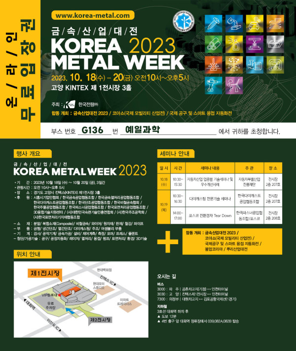 제목 2023년 10월 18일 KINTEX 금속산업대전 참가 작성자 예일과학 작성일 2023-10-12 파일 예일과학이 2023년 10월 18일 KINTEX 금속산업대전에 참가합니다. 첨부된 초대장을 인쇄해오시면 무료로 참관이 가능합니다. 예일과학의 다양한 신제품을 직접 방문하여 체험해 보세요!